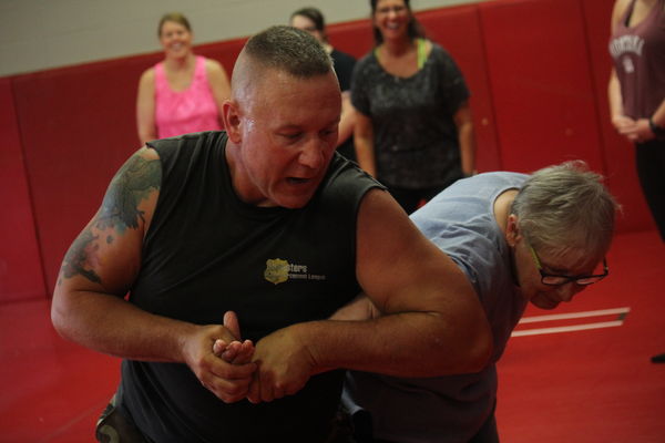Wesley Sebetka demonstrates a technique on a students during his women’s self-defense class on Saturday, July 21 in the middle school wrestling room.