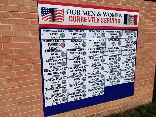 Current military members from the Traer each are recognized for their service to our country through a “currently serving sign set at the Traer Memorial Building listing these men and women.
