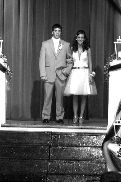 Junior Caleb Edwards leads his date, freshman Molly Karr, down the stage during the Grand March. About forty couples participated in the Grand March