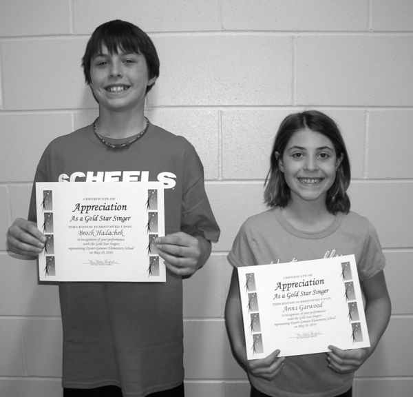 Congratulations to Brock Hadachek, son of Jon and Rene Hadachek, and Anna Garwood, daughter of Scott and LeAnn Garwood, who have been selected as Gold Star Singers to perform at the Gallagher-Bluedorn Performing Arts Center on May 18 for the 2010 Gold Star Awards for Teaching. Both are 5th grade students at D-G Elementary.