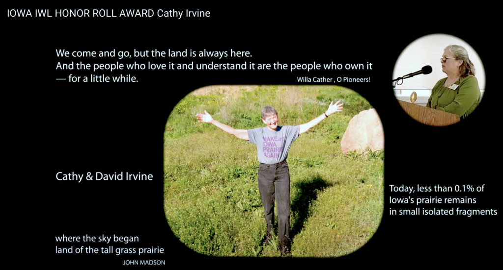 Back on April 20, Irvine Prairie founder Cathy Irvine was honored during the Iowa Division Izaak Walton League of America’s 2024 state convention with an Iowa Honor Roll Award. The award is designed to recognize non-members who have achieved outstanding accomplishments involving conservation, public education, or publicity efforts in keeping with the League’s goals.