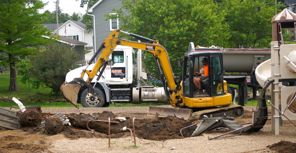 - Contractors with Hatch Grading & Contracting, Inc. work to demolish part of the Dysart-Geneseo Elementary playground last Thursday afternoon. The school has been fundraising for a year to replace the 35-year-old playground with a new, inclusive ‘playground for every child.’ PHOTO BY RUBY F. MCALLISTER