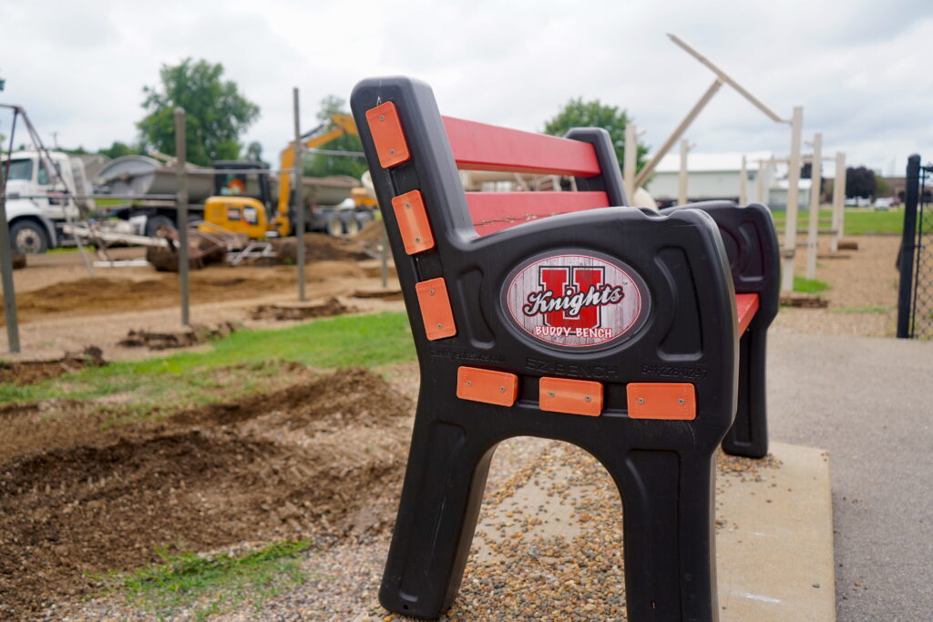 The contractors started with the equipment located on the south side of the playground near the dedication stone. Sitting off to the side standing as a sort of sentry over the whole process was one of the district’s Buddy Benches.