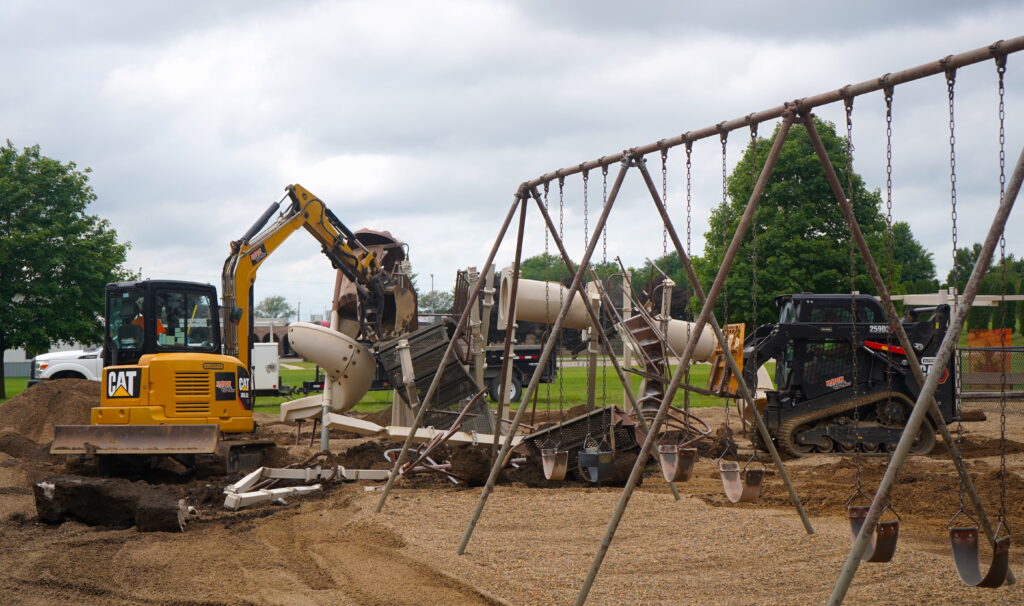 Contractors with Hatch Grading & Contracting, Inc. work to demolish part of the Dysart-Geneseo Elementary playground last Thursday afternoon. The school has been fundraising for a year to replace the 35-year-old playground with a new, inclusive ‘playground for every child.’ PHOTO BY RUBY F. MCALLISTER