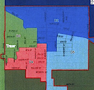 District 4 is completely contained within the City of Traer on the town’s southwest side. The district’s eastern border runs along South Main Street (US 63) while the northern boundary zigzags along Fourth Street, down Walnut Street, across Fifth Street, down Green Street, a brief sojourn along Sixth Street, and then a long sweep down Westview Street with some jogs along Wilson Street and Russell Road. The district’s southern boundary is the city limits.