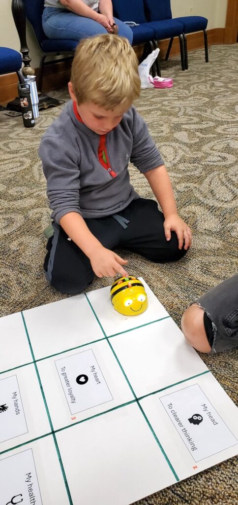 Henry Kopriva pictured using the Bee-Bot programmable robot during Tama County 4-H’s summer visit to the Traer Public Library. PHOTO COURTESY OF JENNY HULME