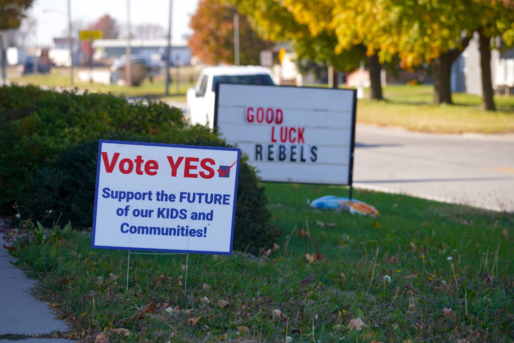A yard sign in support of Gladbrook-Reinbeck’s $17.3 million bond referendum pictured in front of Reinbeck Country Foods in Reinbeck on election day, Tuesday, Nov. 4. Behind the sign, another sign in support of the state-bound Rebel volleyball team is also visible. The bond passed by a mere 16 votes, garnering some 60.86% support. PHOTO BY RUBY F. MCALLISTER