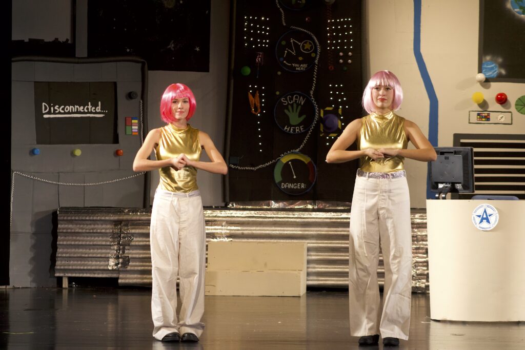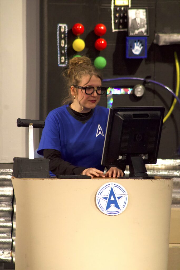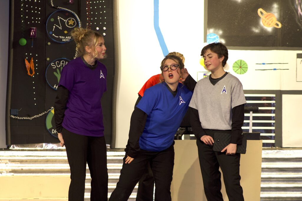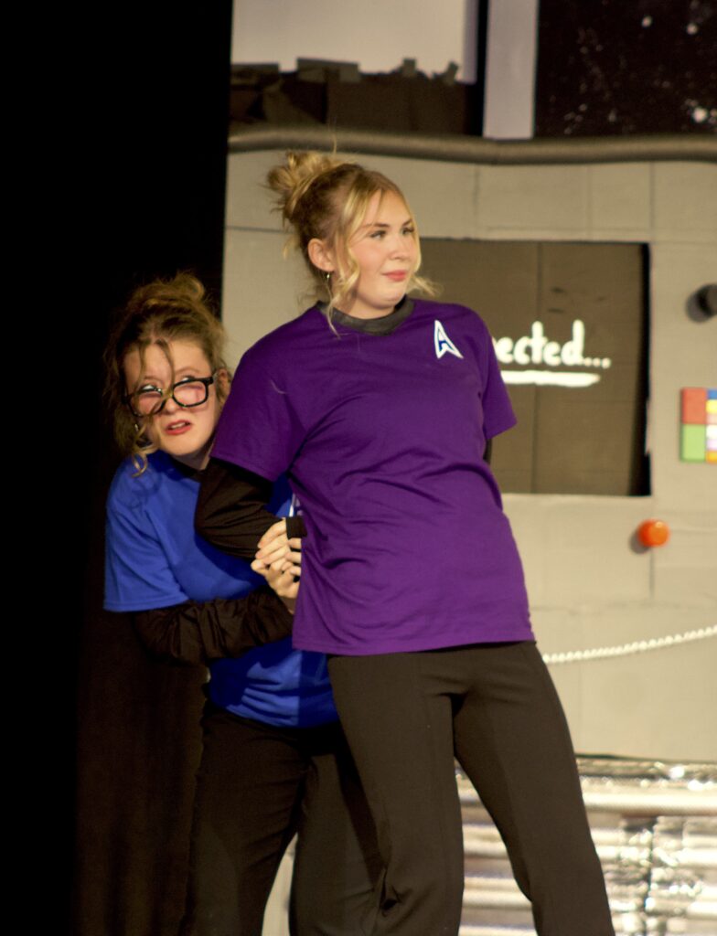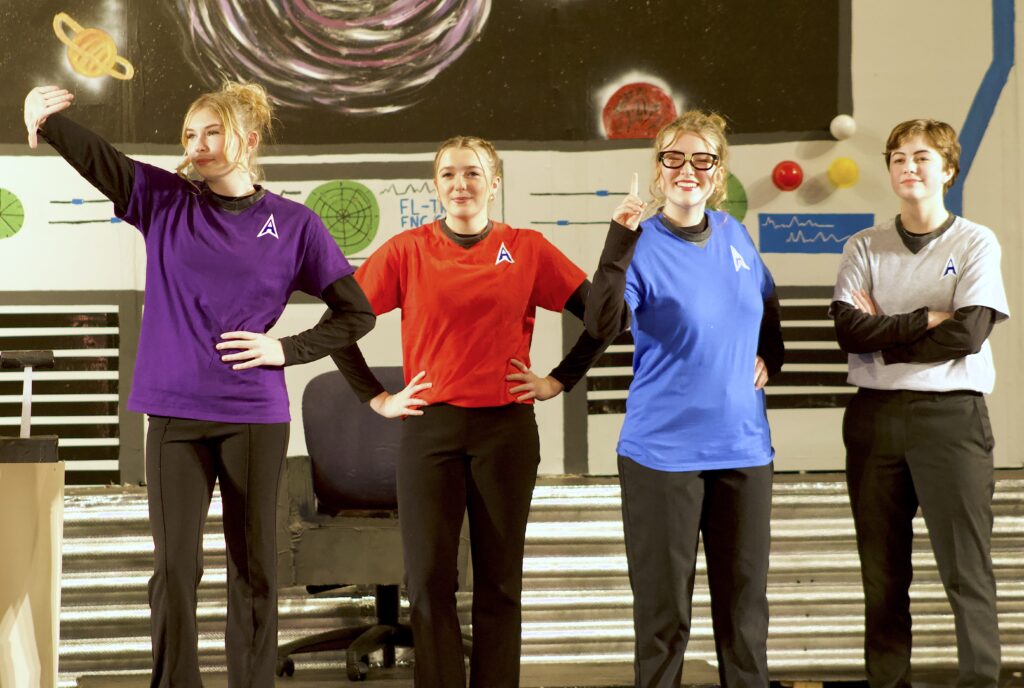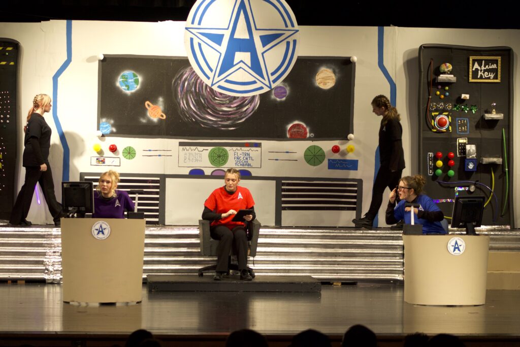 LA PORTE CITY – Union High School’s drama department staged the science fiction comedy “Adventure” by JD Atkins on Nov. 14 and Nov. 15 at Matt Auditorium. Under second-year director Holden Caloud, the two-act show featured seniors Jersey Siech, Addie Engle, and Ella Grote in the lead roles of Captain Adrian Key, Commander Quinn, and Lieutenant Dorian, respectively. Per the publisher’s play synopsis: “Welcome aboard the Starship Adventure! For 100 missions, Captain Adrian Key and the Galactic Voyagers have ventured into deep space on missions of science and discovery – that is, until High Command decides to convert the aging Adventure into a cruise ship for galactic tourists. When the Voyagers ferry these unwelcome guests – as well as an upstart Lieutenant trying to usurp command – to Captain Key’s forced retirement party, a mysterious computer malfunction sets their final flight on a collision course with a gravity well. Can the Voyagers fix their beloved ship in time to avert disaster, even as a tourist revolt threatens to scuttle their efforts? Whatever the outcome, it is sure to be an ADVENTURE to remember!”