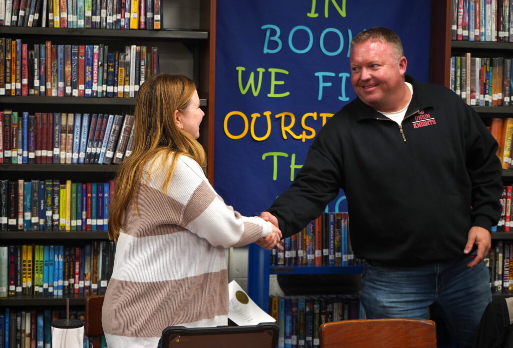 - Union school board president Ben Schemmel, right, congratulates newly-elected District 2 Director Amanda Sheffler, left, on Monday, Nov. 24, in Dysart. PHOTO BY RUBY F. MCALLISTER