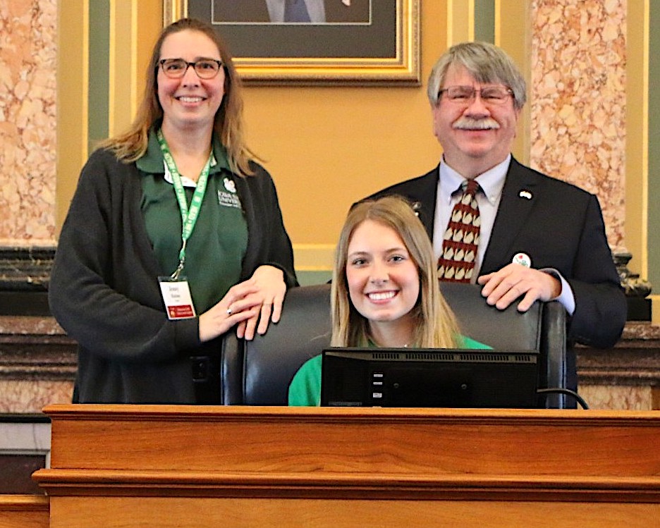 From left, Jenny Hulme, Belle Werner (seated), and state Rep. Dean Fisher (R-Montour) pictured on Jan. 21, 2026, in Des Moines during Extension and 4-H Voices Day at the Capitol. CONTRIBUTED PHOTO