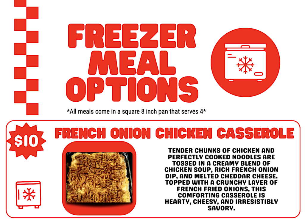 The “comforting” french onion casserole is described as “tender chunks of chicken and perfectly cooked noodles tossed in a creamy blend of chicken soup, rich french onion dip, and melted cheddar cheese, all topped with a crunchy layer of french fried onions.”