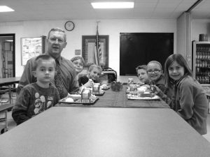 Pictured eating a special lunch with Mr. Foster are left to right Landon Wirtz, Kindergarten, Mr. Foster, Elementary Principal, Ben Mason, fifth grade, Zach Blackledge, first grade, Nathan Urban, second grade, Shelby McKinley, fourth grade, and Hope Brubaker, third grade. Not pictured was ...