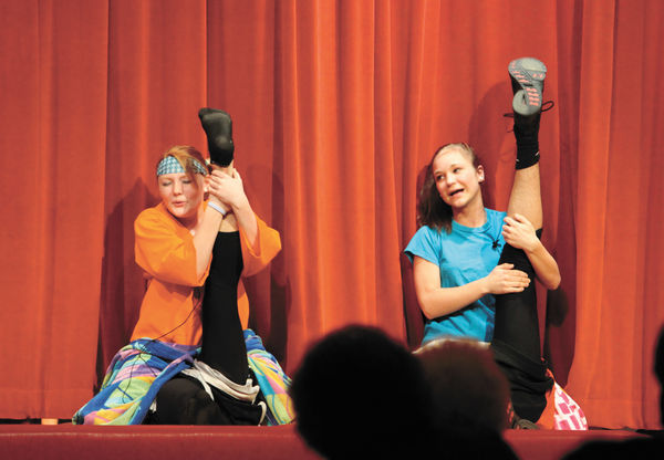 Stretching: Aryn Isenhower (right) Emma Knoop (left) and Unseen the Boerm Boys. Photo by Megan Mesch