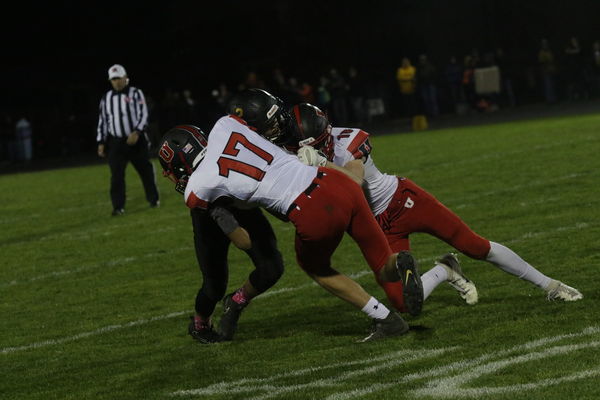- Carter Assmussen (17) and Levi Gray (18) tackle a Trojan receiver. The two seniors combined for 8.5 tackles in the loss to West Marshall.
