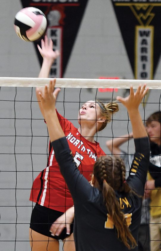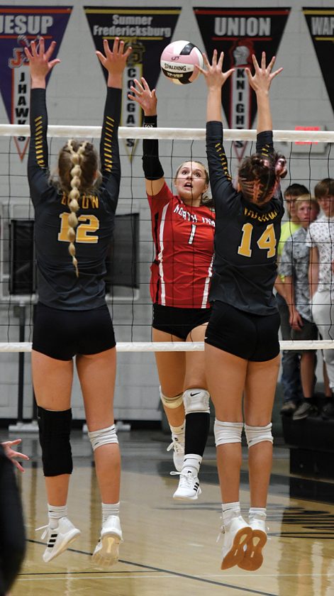North Tama’s Lainey Willenbring (1) tips the ball past BCLUW blockers Allison Engle (12) and Mallori Jones (14) during Thursday’s non-conference volleyball match in Conrad. The Class 1A No. 13 Redhawks won a hotly-contested sweep, 25-23, 27-25, 25-21. Photo by Noah Rohlfing/Times-Republican