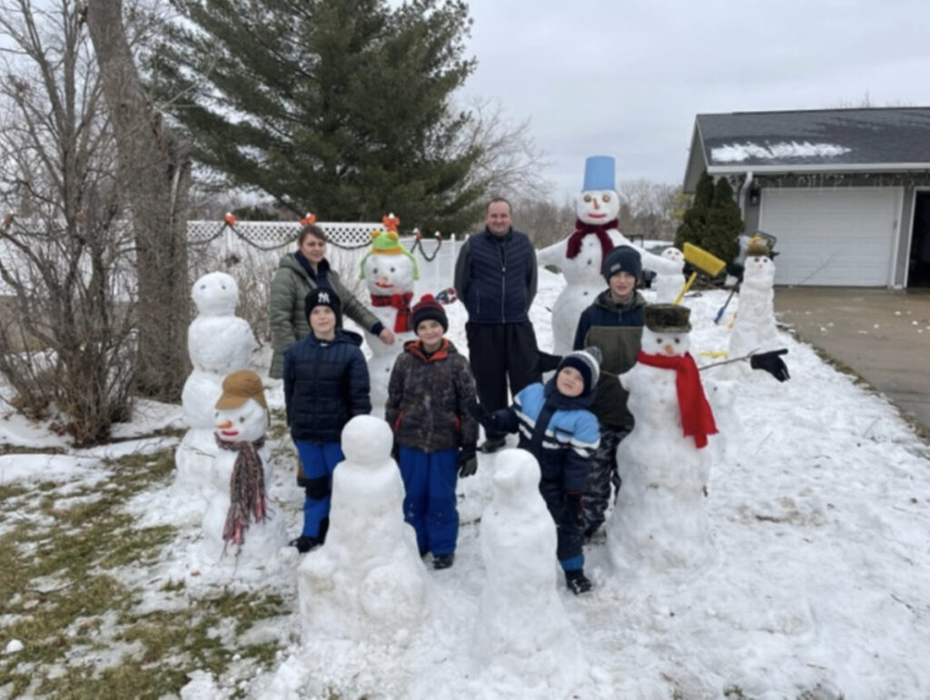 The Reznik family is from Ukraine and are being hosted in Marshall County. They enjoyed the Christmas snow by working to make snowmen for everyone in the home including mom, dad, grandma, four kids and even the family dog Scruffy. SUBMITTED PHOTO