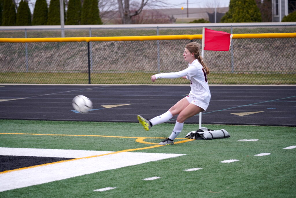 - Senior Molly Grote pictured executing a corner kick for Union-North Tama during this past Monday’s season-opener played against the Vinton-Shellsburg Vikettes at Karr Athletic Complex in Vinton. PHOTO BY RUBY F. MCALLISTER