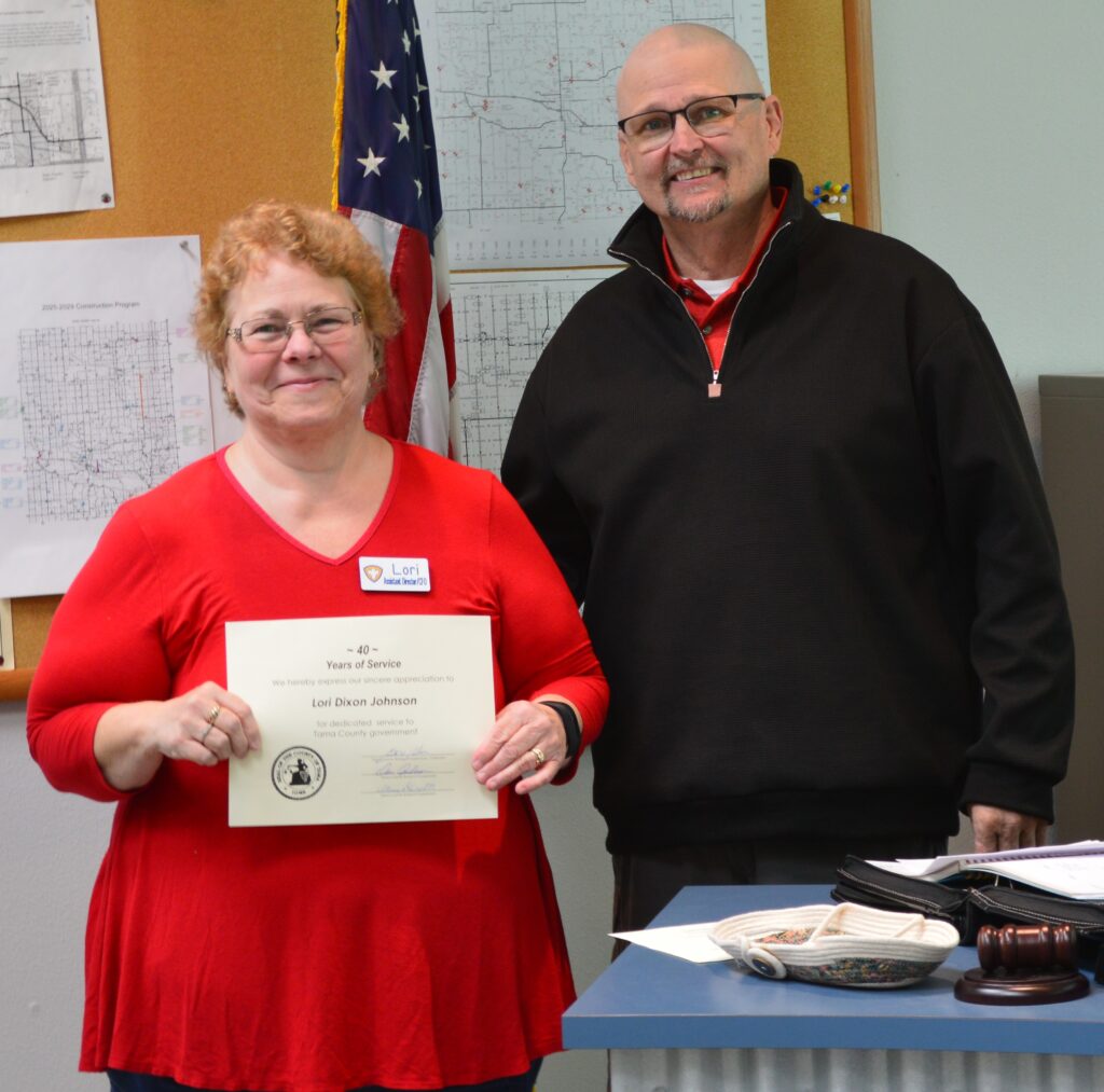 Lori Dixon Johnson with Tama County Public Health receiving her 40 years of service certificate from Supervisor Chairman Curt Hilmer. PHOTO BY MICHAEL DAVIS