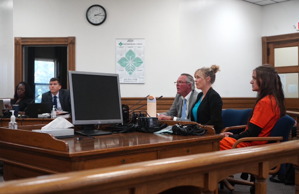 Karina Cooper, right, listens during a pre-trial hearing held on Friday, June 20, in Tama County District Court in Toledo ahead of her first-degree murder trial set to begin July 1 in Linn County. Cooper is facing trial in connection with the June 2021 death of her husband Ryan Cooper. Also pictured, defense attorneys Aaron Hawbaker (left) and Nichole Watt (center). PHOTO BY RUBY F. MCALLISTER