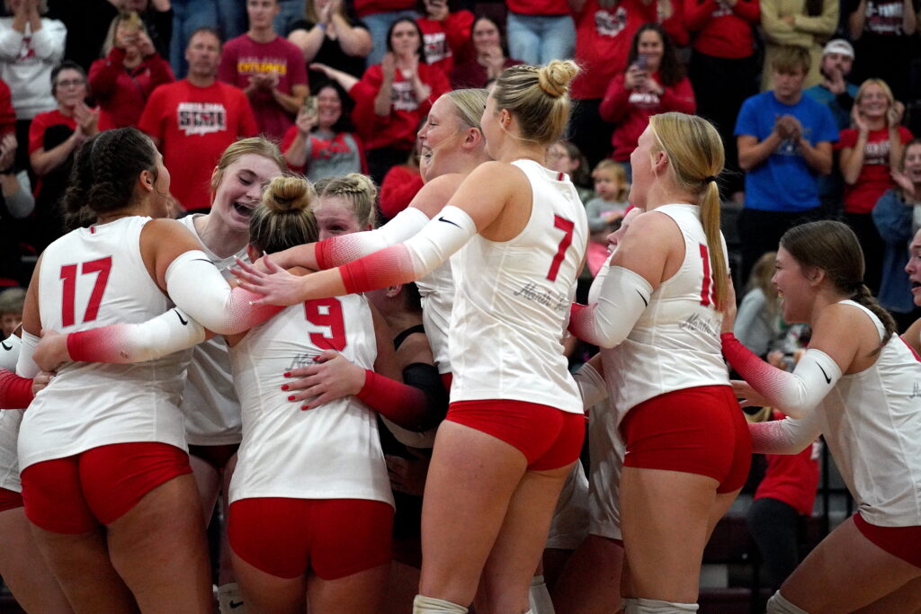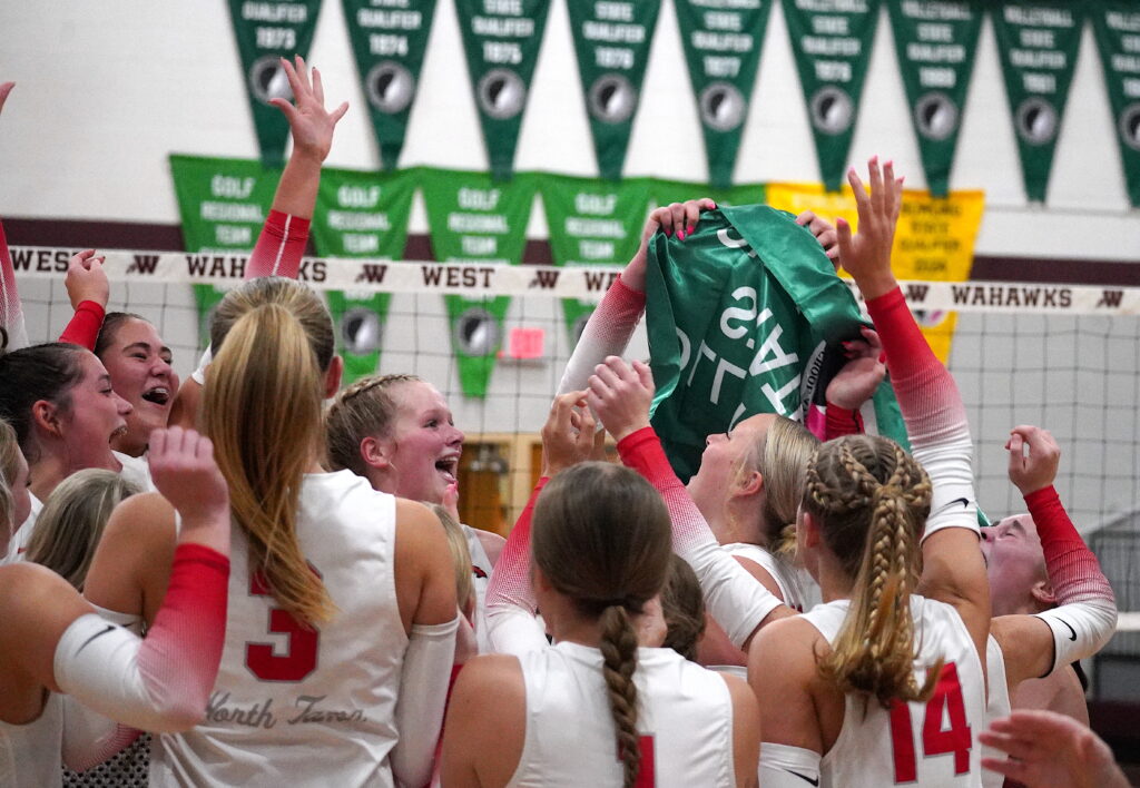 The North Tama Redhawks celebrate their 3-0 victory over the Cedar Ridge Christian Regents on Oct. 29 at Waterloo West High School during the Class 1A Region 3 final. From left, Lily Sell (17), Kahlia Even (back left), Cayleigh Heller (back center), Kruiz Ewoldt (9), Alaney Sienknecht (back right), and libero Addison Hochstetler (4). PHOTO BY RUBY F. MCALLISTER