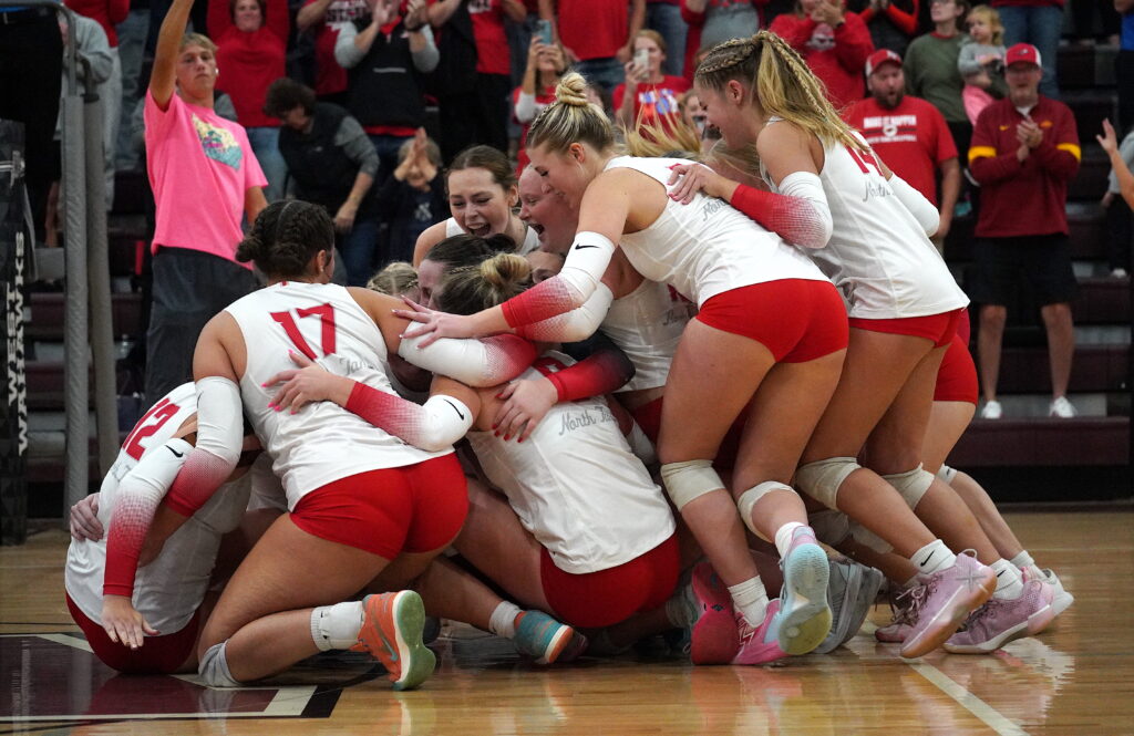 - Members of the North Tama volleyball team rush the court to embrace one another immediately following the conclusion of the Class 1A Region 3 final on Wednesday, Oct. 29, at Waterloo West High School. The No. 3 Redhawks swept the No. 13 Cedar Ridge Chrstian Regents 3-0 (25-12, 25-17, 25-20) for the regional championship and a sixth trip to the state tournament. PHOTO BY RUBY F. MCALLISTER