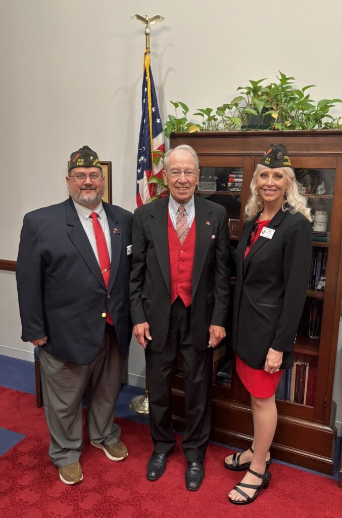 Sen. Chuck Grassley, center, pictured on Sept. 10, 2025, in his Washington, D.C. office with VFW Commander-in-Chief Carol Whitmore (right), a Traer native. PHOTO COURTESY OF CHUCK GRASSLEY/X