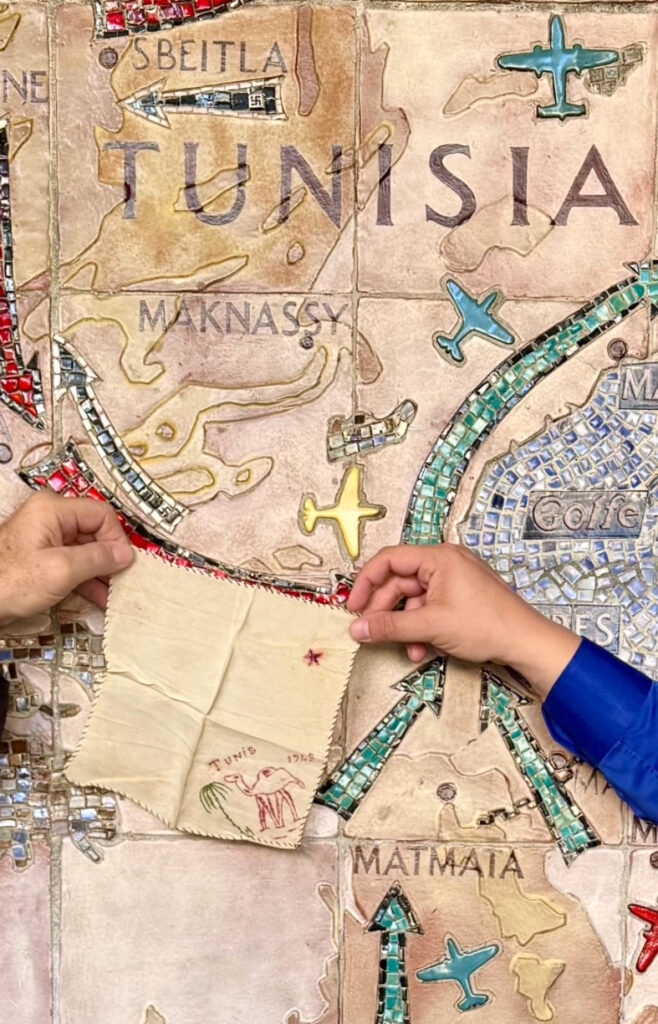 Dale Morrison's "Tunis 1943" handkerchief in front of a mosaic of the World War II North Africa campaign in Tunisia. PHOTO COURTESY OF DAVID MORRISON