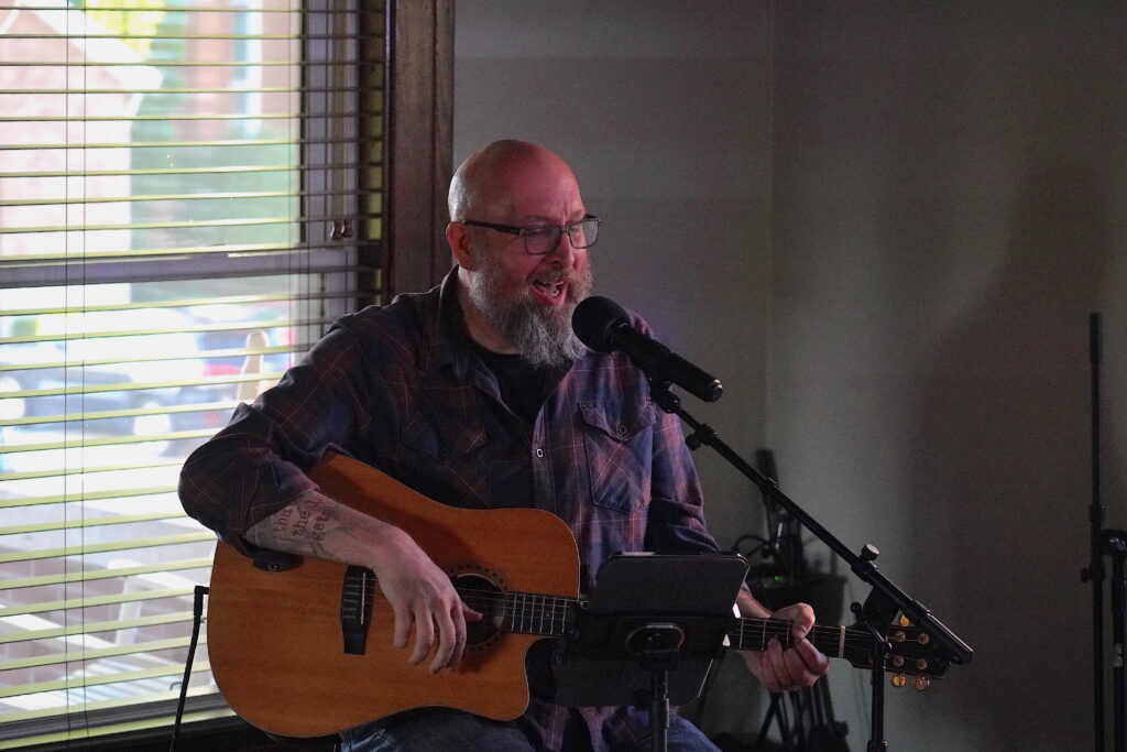 Jim Coppoc performs on June 25, 2025, at Traer Ripley UCC’s The Parsonage. Coppoc, Ripley’s bridge pastor, recently won Poet of the Year at the 4th annual Iowa Music Awards. PHOTO BY RUBY F. MCALLISTER