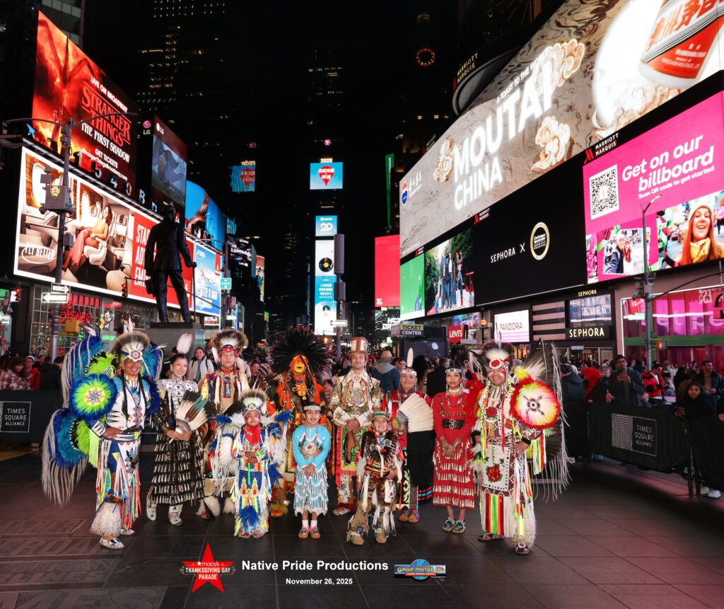 - Mother/son duo Kathy (back row, third from right) and Corbin (back row, third from left) Shuckahosee of the Meskwaki Nation performed in this year’s Macy’s Thanksgiving Day Parade in New York City this year as part of the Native Pride Productions float. In addition to the parade, the Native Pride group also performed at Times Square the night before Thanksgiving (pictured). PHOTO BY KEVIN MCCORMICK/GROUP PHOTOS INC.