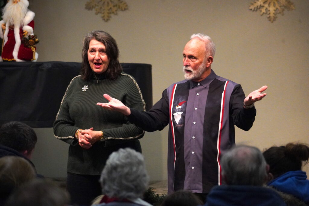 As has become tradition, ahead of the parade – which trundled down snow-covered Second Street just after 6:30 p.m. amid a cold wind and some light snow-snow mix — the Traer Public Library’s Kupka Cultural Center was brimming with anticipation as folks eagerly awaited a performance by the Union Carolers. But, alas, the carolers were delayed, leading librarian/programming director Laurie Schafer to improvise by inviting retired Pastor Mark Keefer to help her lead the packed room in singing Christmas carols. The duo more than earned a place on the ‘Nice List’ this year with their rousing performance which included an audience-participatory version of “The Twelve Days of Christmas.”