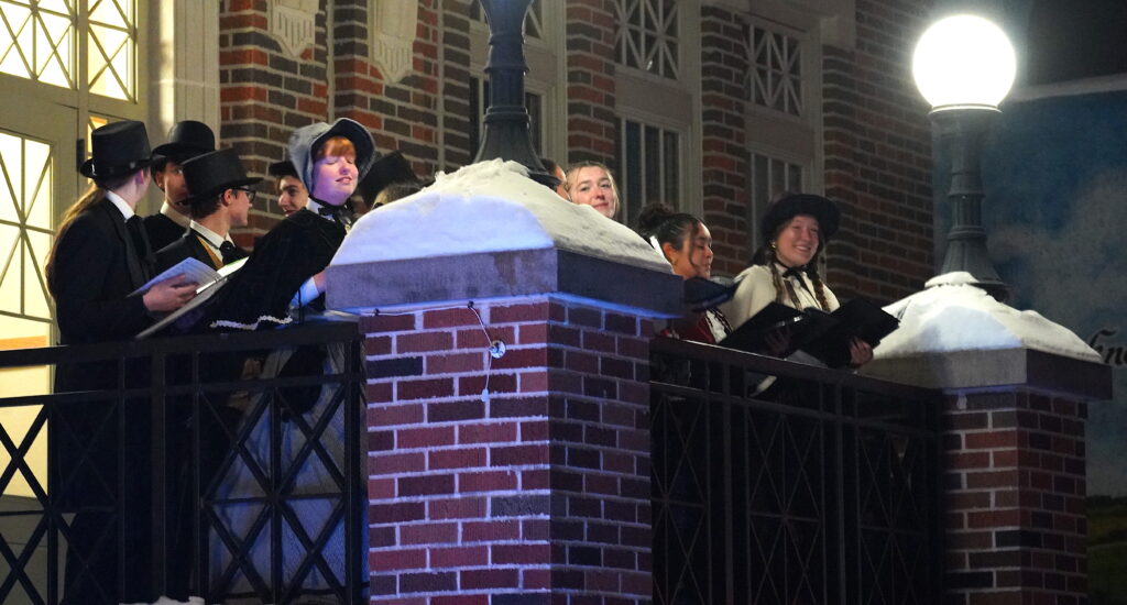 As the clock neared 6:30 p.m. – and with the Union Carolers still unaccounted for – Schafer urged the audience to head outside for the parade. As luck would have it, the high school a cappella ensemble – now in their 23rd season – appeared just prior to the parade’s start. The group performed from the library’s balcony overlooking Second Street as the parade passed by beneath and with the audience gathered on the sidewalk below.