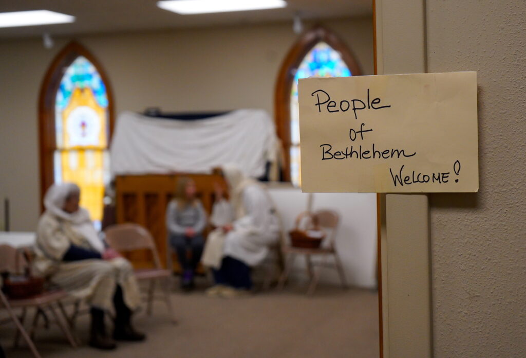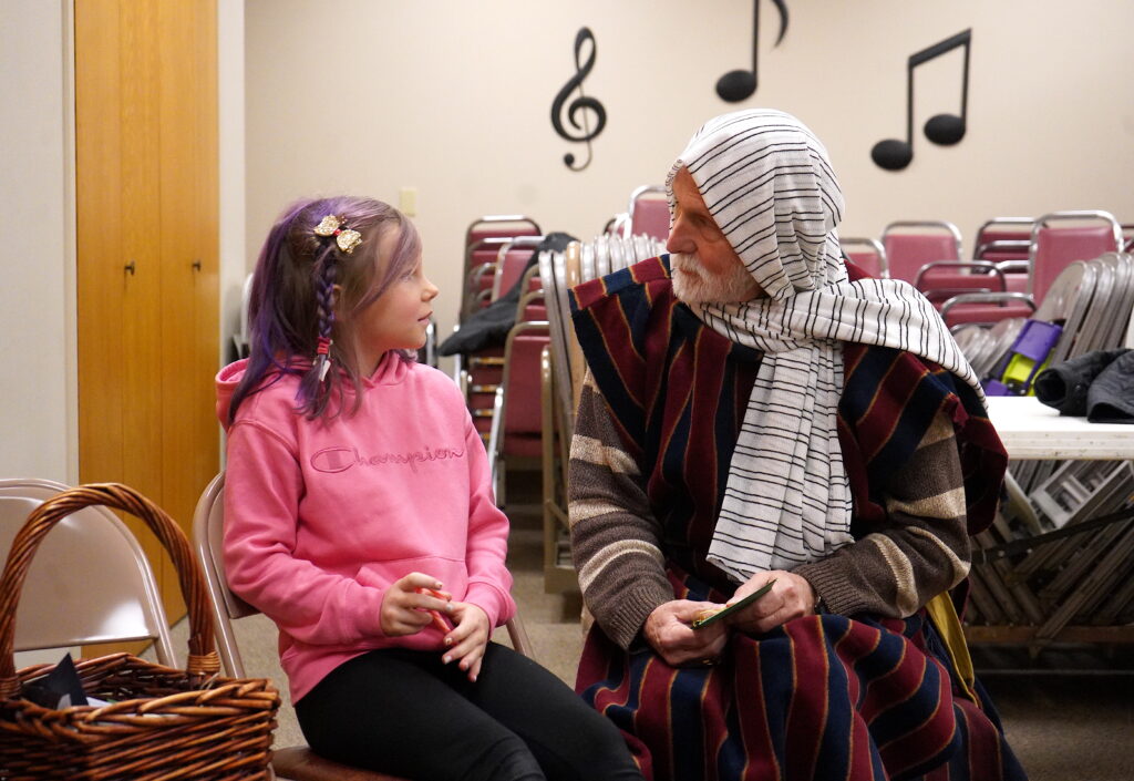 From there, children ventured downstairs for the main event – shopping in the Christmas Store. At the entrance to the store’s large room, children were given a clipboard for their list plus a red or blue shopping basket. Preschoolers and kindergarteners received assistance from a volunteer as they perused the many tables. Once finished, children moved on to the wrapping stations – situated on the room’s periphery – where their selections were expertly prepared for gifting. They were then zoomed back upstairs (with their gifts) by elevator to a room located behind the chancel for a quick chat with the “People of Bethlehem.” This year’s cast featured Rev. Gideon Gallo of Gladbrook United Methodist Church, Rev. Mark Keefer of Traer United Methodist Church, Kay Lowry, Sue Storjohann, and Sierra Wiebensohn.