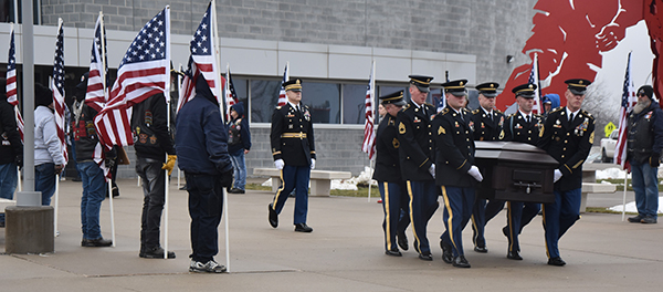 The honor guard carries the casket of SSgt. William Nathaniel “Nate” Howard to the waiting hearse outside of the Marshalltown High School Roundhouse on Saturday, Dec. 27, 2025. PHOTO BY LANA BRADSTREAM