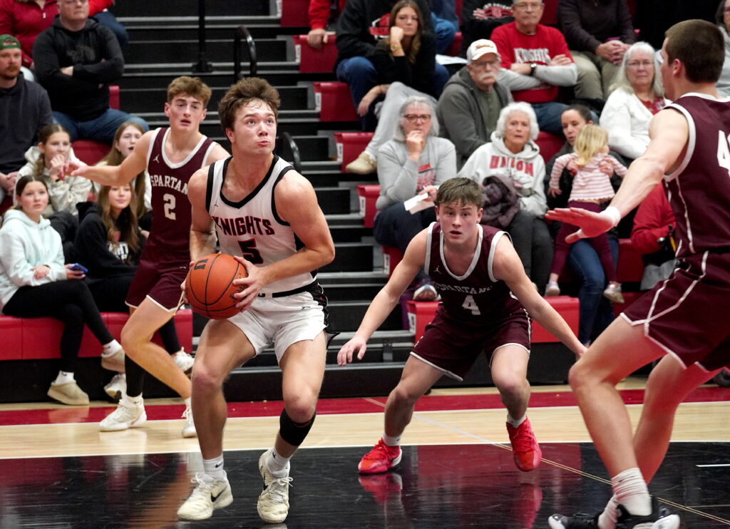 The opening tip would go the Spartans’ way, but Union set the tone fast. Strong defense led to a Spartan turnover. Senior Sawyer Spence kicked off the Knights’ scoring, draining a 3-point shot a minute into the game. The Spartans used strong ball movement and quick passing to attack the Knights. The game was physical from the start, with Union Knight players flying across the court. That did not impact the Knights, as they forced two early Grundy Center turnovers. A Union quick pass to Spence down low would lead to a basket and a 5-4 Knight advantage. Wash, rinse, repeat – another quick Union pass to senior Cam Mullen added two more. At the halfway point of the quarter, the Knights started to make their move. Another 3-pointer by Spence put the Knights up 10-8. The following Grundy Center possession was ended with a Spence steal and quick pass downcourt to a sprinting senior Maddux DeWinter who was fouled hard. The Knights were up 12-8. A block by senior Tate Van Dyke and another Knights fast break. The teams continued to trade blows. Senior Caden Sorensen added a 3-pointer of his own with just over a minute to play in the quarter. Sorensen, a four-year starter who was shooting nearly 40% from deep entering the game, would need to tap into that experience to lead the Knights the rest of the game. The Sorensen trey was the start of a 9-0 Knights run in the final 1:30 of the quarter, giving the Knights a 23-15 lead.