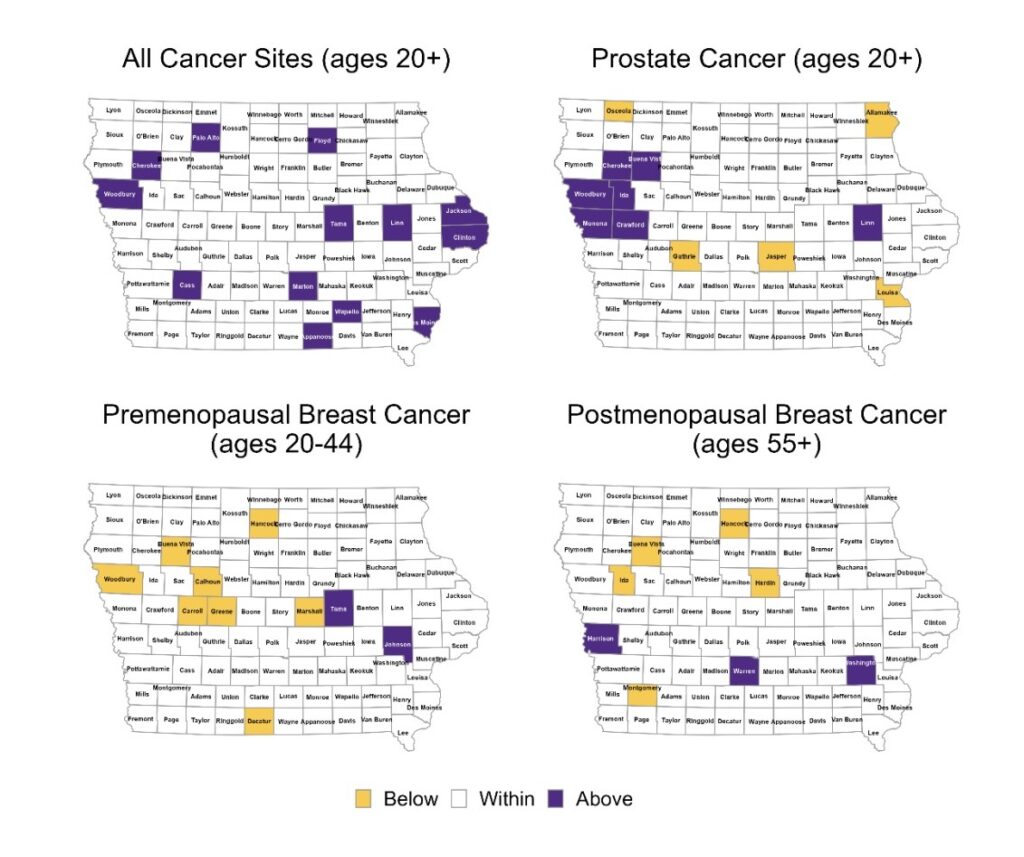 Within that cluster, Iowa had the highest overall cancer rate, the highest age-adjusted rates of lung cancer and colorectal cancer, the second highest age-adjusted rate of breast cancer, and the third highest age-adjusted rates of prostate cancer and melanoma. The report goes on to break down the counties such as Tama identified as “higher than expected” in certain categories.