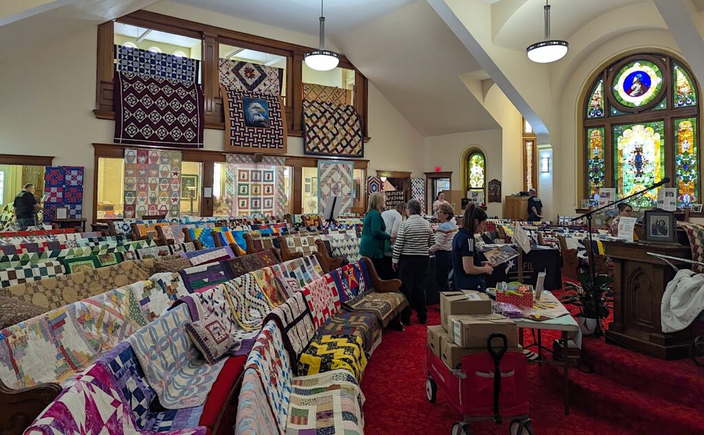 At Ripley UCC, Mission Quilts held down the pews and splashed color everywhere! A delicious meal, served in the Fellowship Hall, was provided by the Ripley Missions Committee and Traer United Methodist Church members. The lucky winner of the quilt raffle was Cassandra Gaston.
