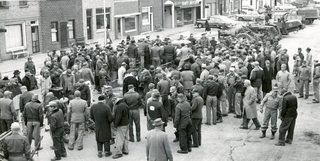 Traer ag businesses sponsored a consignment auction in the business district on Monday March 10, 1958. Sale items included farm implements, tractors and trucks. This photo may have been taken from the balcony of the Winding Stairs looking southwest.