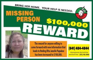 MESKWAKI SETTLEMENT — A search began on Saturday, June 8, and finished on Wednesday, June 12 for missing Meskwaki woman Rita Janelle Papakee, who was last seen on Jan. 16, 2015.
