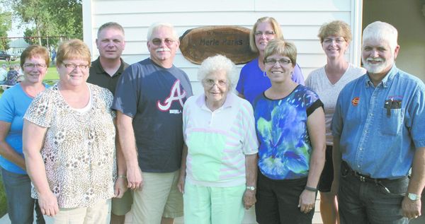 The children of the late Merle Parks are pictured gathered with their Mother in front of the popcorn stand in Garwin City Park. The stand was recently dedicated “In Memory of Merle Parks,” who was was the main “push” behind getting the stand constructed. Pictured from left, are Mary Boege of Garwin; Anne Barloon of Garwin, Paul Parks of Sycamore, Ill.; Les Parks of Garwin; Carol Parks of Garwin; Terri Goos of West Liberty; Karen Roseland of Le Grand; Susie Strohbehn of Gladbrook and Joe Parks of Garwin. Two children were unable to attend the dedication: Glen Parks of Sandwich, Ill., and Denny Parks of Oskaloosa.