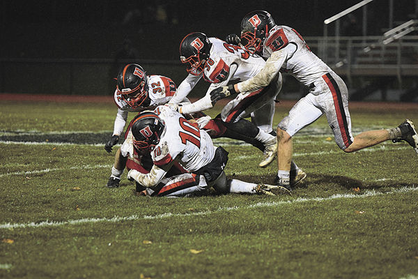 Hunter Fleshner, Britt Rollison, Koby Alpers and Kyle Gross tackle during Union’s 42-0 thrashing of Aplington-Parkersburg last Friday night. The Knights will look to avenge a 28-21 loss from a few weeks ago against District foe Cascade this Friday, November 3.