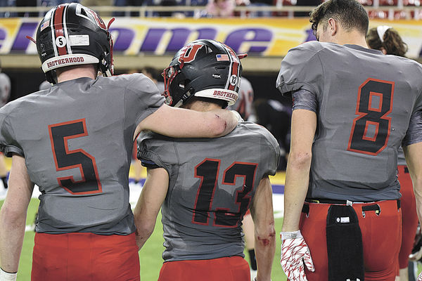 (Photo by Krystal Schmitz) - The “Brotherhood” signage on the back of Union’s helmets perfectly describes this scene with teammates Koby Alpers, Britt Rollison and Silver Schmitz commiserating after the loss. For more photos, pick up a copy of this week's print issue.