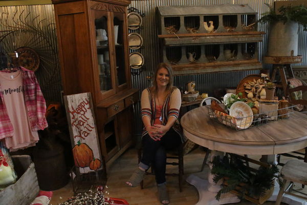 Heather Mennenga with one of her store displays at Rust and Roses at 603 Main Street in Dysart open for business.