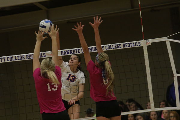 - Megan Hudson hits over two NIACC blocks during sophomore night on Wednesday, Oct. 10. Hudson has 292 kills on the season so far, as well as 38 blocks and 192 digs for the RedTails.