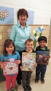 The Fine Arts Women's Club presented books to 31 children at Dysart-Geneseo Elementary's Kindergarten Roundup on April 21, 2017 as a project to encourage reading. Pictured is Marcia Taylor of the Fine Arts Club with three of the children receiving books. The children pictured with her are (L to ...