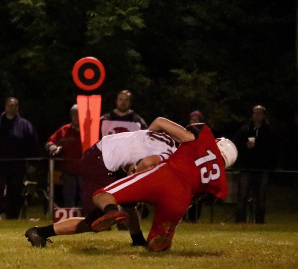 Noah Bond (13) recorded 4.5 tackles (three solo) against the Grundy Center Spartans on Friday, Sept. 28. Bond also had 57 yards on two receptions for the Redhawks.