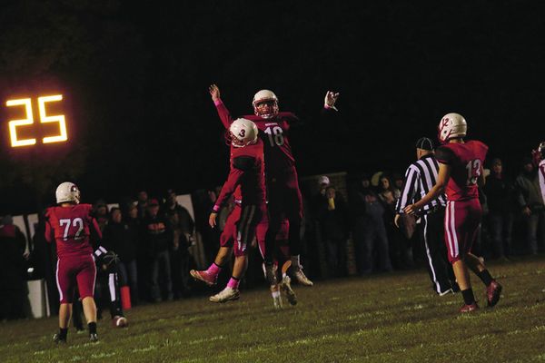 - Cael Even (18) and Skyler Staker (3) celebrate after connecting for a 66-yard touchdown against the Postville Pirates on Friday, Oct. 12.