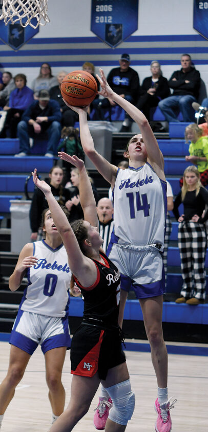 Gladbrook-Reinbeck’s Kennedy Brant (14) goes up over North Tama’s Lydia Taylor for two of her career-high 28 points during last Thursday’s basketball game in Reinbeck. PHOTO BY JAKE RYDER