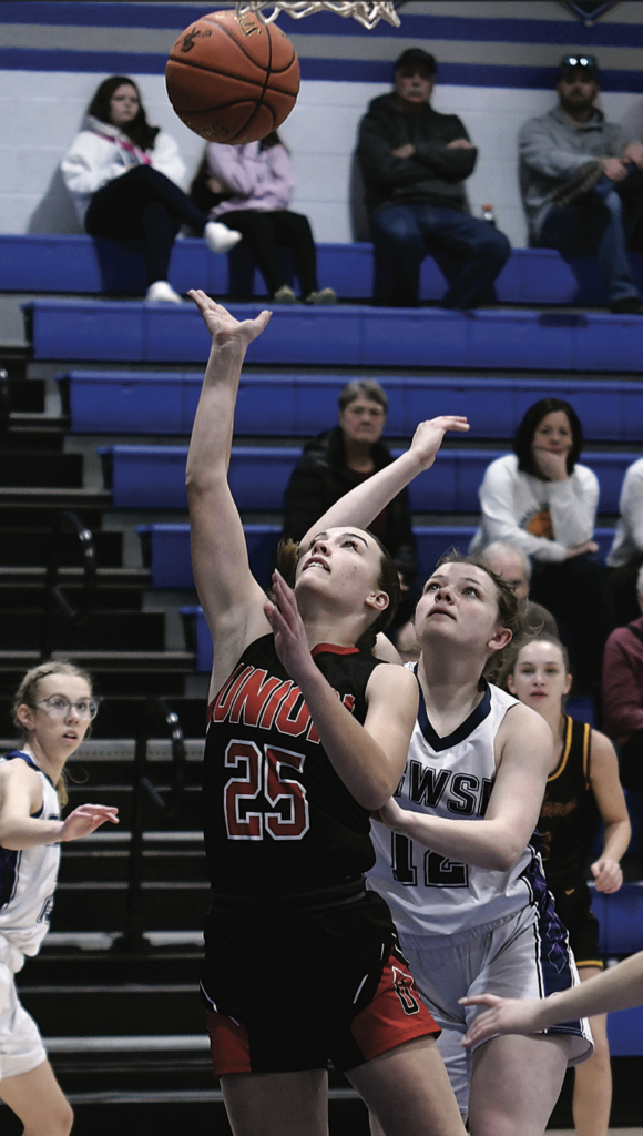 Union’s Ava Mills (25) scores a layup in front of AGWSR defender Catelynn Koop (12) during the NICL Senior All-Star Basketball Game Friday, March 15, in Reinbeck. PHOTO BY JAKE RYDER