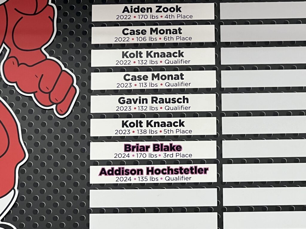 The Kathi Knaack Memorial Redhawks State Wrestling board pictured this past season in Traer after both wrestlers Briar Blake and Addy Hochstetler qualified for the state meet - the first girls to do so in North Tama school history. PHOTO COURTESY OF ANDREW KNAACK