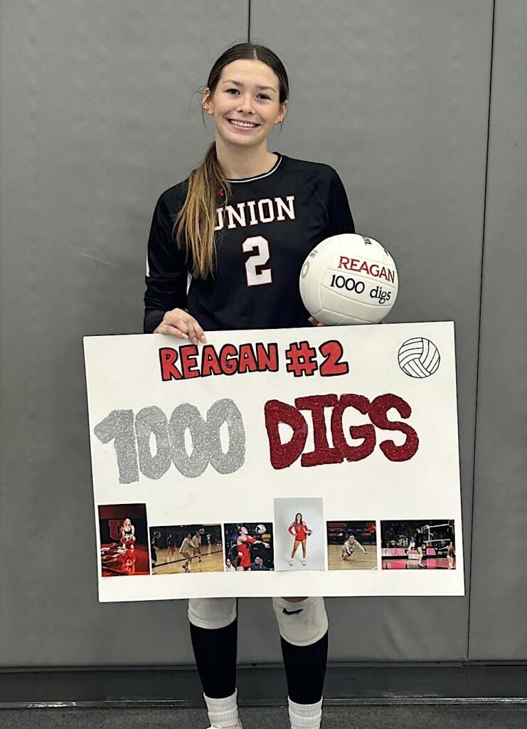 BELLEVUE – Union volleyball outside hitter Reagan Glenn collected her 1,000th career dig during the Saturday, Sept. 27 Marquette Invitational hosted by Marquette Catholic in Bellevue. The Knights, led by senior captains Glenn and Emily Anton, swept the tournament on Saturday, taking home the trophy by defeating Bellevue, Maquoketa, Midland, the host Defenders, and Monticello. Heading into this week, the Knights had only dropped three games all season and were ranked No. 5 in Class 2A.